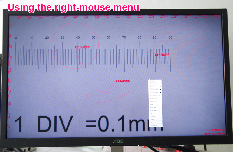 - Geometric measurement: Line length, radius fixed circle, two point fixed circle, three point fixed circle, concentric circles