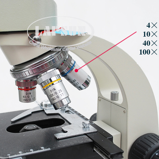 - 4 achromatic objectives: 4X, 10X, 40X, 100X