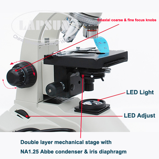 - Double layer mechanical stage with NA1.25 Abbe condenser & iris diaphragm