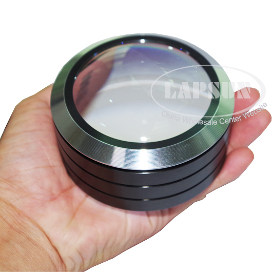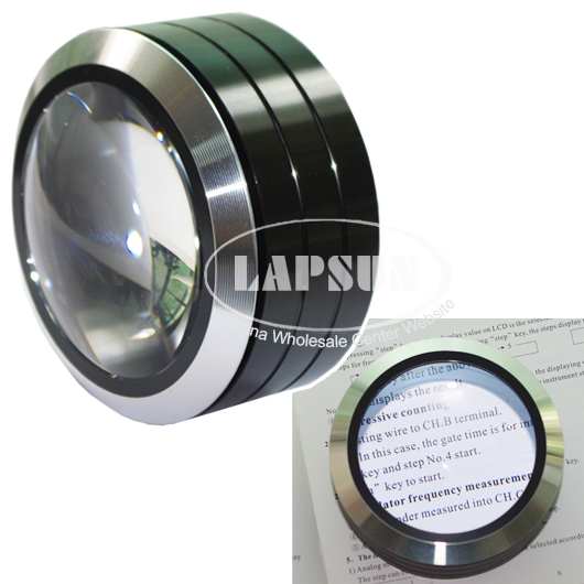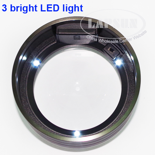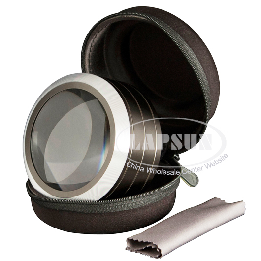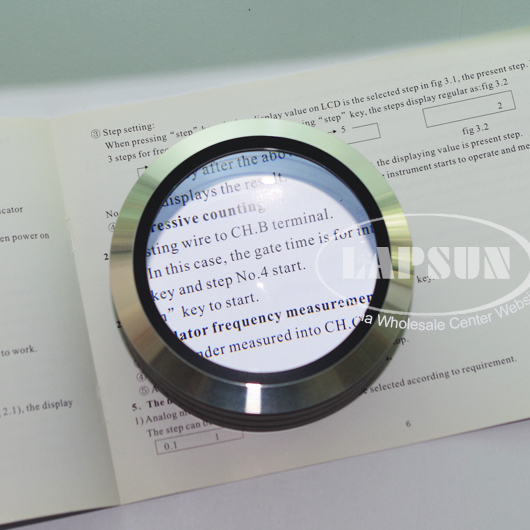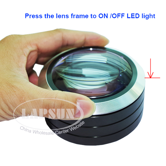 The premium-quality, 5x LED Lighted, desktop magnifier. It is constructed with a durable, Silver Aluminum lens frame, gunmetal aluminum base, and a high quality glass magnifying lens. The lens diameter is 75mm, with a 5X magnification lens that utilizes 3 super bright LED lights and an auto-off function to conserve battery power. Simply press the lens frame and enjoy larger, brighter text. The MAG03 comes with cleaning cloth, instructions, and a carrying case.