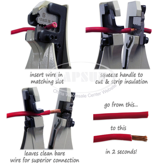 - Patented mechanism automatically holds wire, cuts & strips insulation clean leaving bare wire